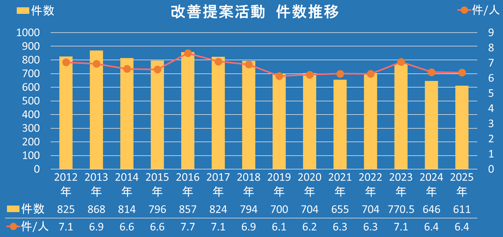 「改善提案活動」は、仕事の質を向上させ、高品質な商品を提供することを目指した改善活動です。私たちはこの活動を通じて、良い商品を社会に届ける喜びを感じ合い、共有していきます。